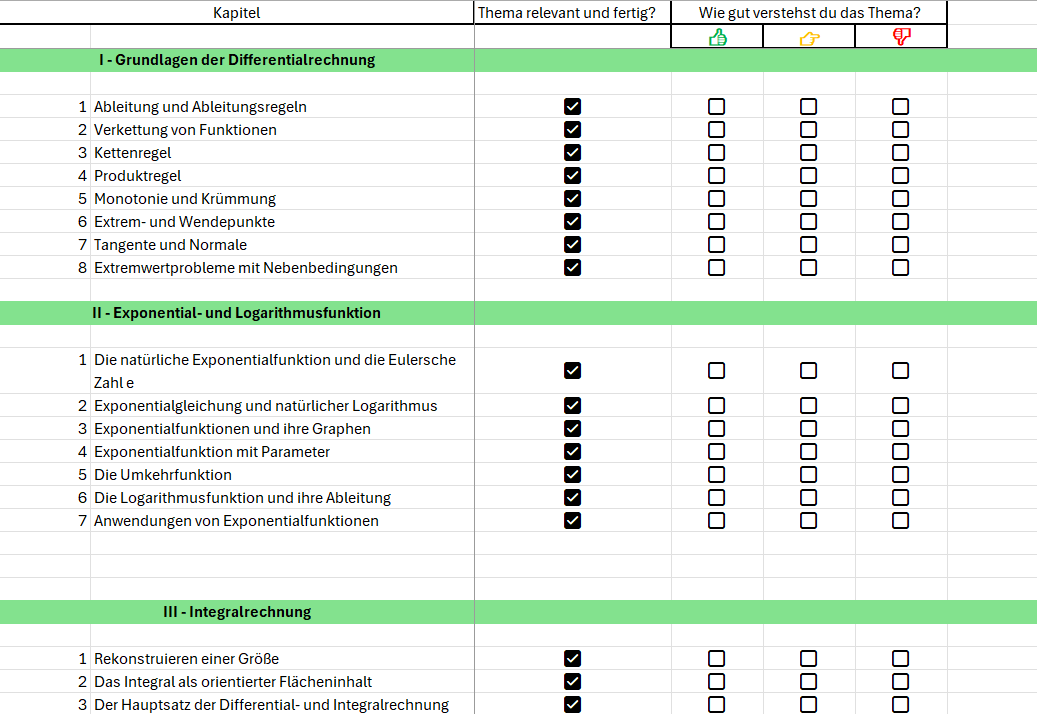 Diese Excel-Tabelle möchte ich dir gratis zum Downloaden geben, damit du ganz bequem eine Übersicht aller Themen hast. Außerdem kannst du die Themen für dich bewerten, wie gut du jedes einzelne Thema momentan verstehst.